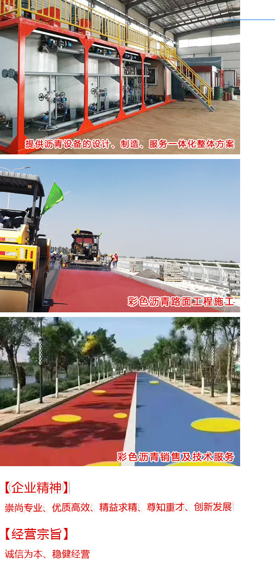 公司業(yè)務(wù)包含:廢舊輪胎回收利用、各種(橡膠、改性、乳化、彩色)工廠式、拼裝(可移動(dòng))式瀝青設(shè)備、瀝青脫桶設(shè)備、瀝青撒布車(chē)、各噸位瀝青儲(chǔ)存罐的制造;瀝青材料系列;瀝青乳化劑(中裂.慢裂.快裂)、SBS改性劑、SBR膠乳、橡膠粉、瀝青穩(wěn)定劑、瀝青助熔劑、橡膠油等。瀝青產(chǎn)品:橡膠瀝青、SBS/SBR改性瀝青、乳化瀝青、彩色瀝青、噴涂速凝橡膠瀝青防水、非固化橡膠瀝青防水、橡塑瀝青防水加工及銷(xiāo)售。預(yù)防性養(yǎng)護(hù)施工:超薄精罩面、加纖同步碎石封層.加纖稀漿封層、微表處施工、透層粘層、彩色瀝青路面施工、橋面拋丸、橋面防水、道路養(yǎng)護(hù)施工、道路劃線及保潔服務(wù)等;公司技術(shù)力量雄厚,長(zhǎng)期致力于新材料、新工藝的研發(fā)與應(yīng)用推廣,堅(jiān)持與中石油/中石化、國(guó)內(nèi)外高等院校、科研機(jī)構(gòu)技術(shù)交流合作。公司擁有自主知識(shí)產(chǎn)權(quán)幾十項(xiàng)科研成果,授權(quán)專(zhuān)利8項(xiàng),審核專(zhuān)利6項(xiàng),目前在山東、廣西、甘肅、安徽、吉林等均有生產(chǎn)基地。施工設(shè)備二十余套業(yè)務(wù)遍布全國(guó)各地。在公路路面建設(shè)過(guò)程中,從規(guī)劃設(shè)計(jì)、設(shè)備生產(chǎn)、瀝青配方研發(fā)、現(xiàn)場(chǎng)施工,我們一直參與其中。公司將深入產(chǎn)業(yè)鏈發(fā)展,將從單純的“道路材料及設(shè)備供應(yīng)商”向“基礎(chǔ)設(shè)施工程投資商”過(guò)渡,在當(dāng)?shù)爻浞謪⑴cPPP模式下的基礎(chǔ)設(shè)施項(xiàng)目,地方的省國(guó)道、市政公路工程、高速公路工程等項(xiàng)目。響應(yīng)國(guó)家一帶一路發(fā)展戰(zhàn)略,開(kāi)拓國(guó)際市場(chǎng),提升國(guó)際影響力。